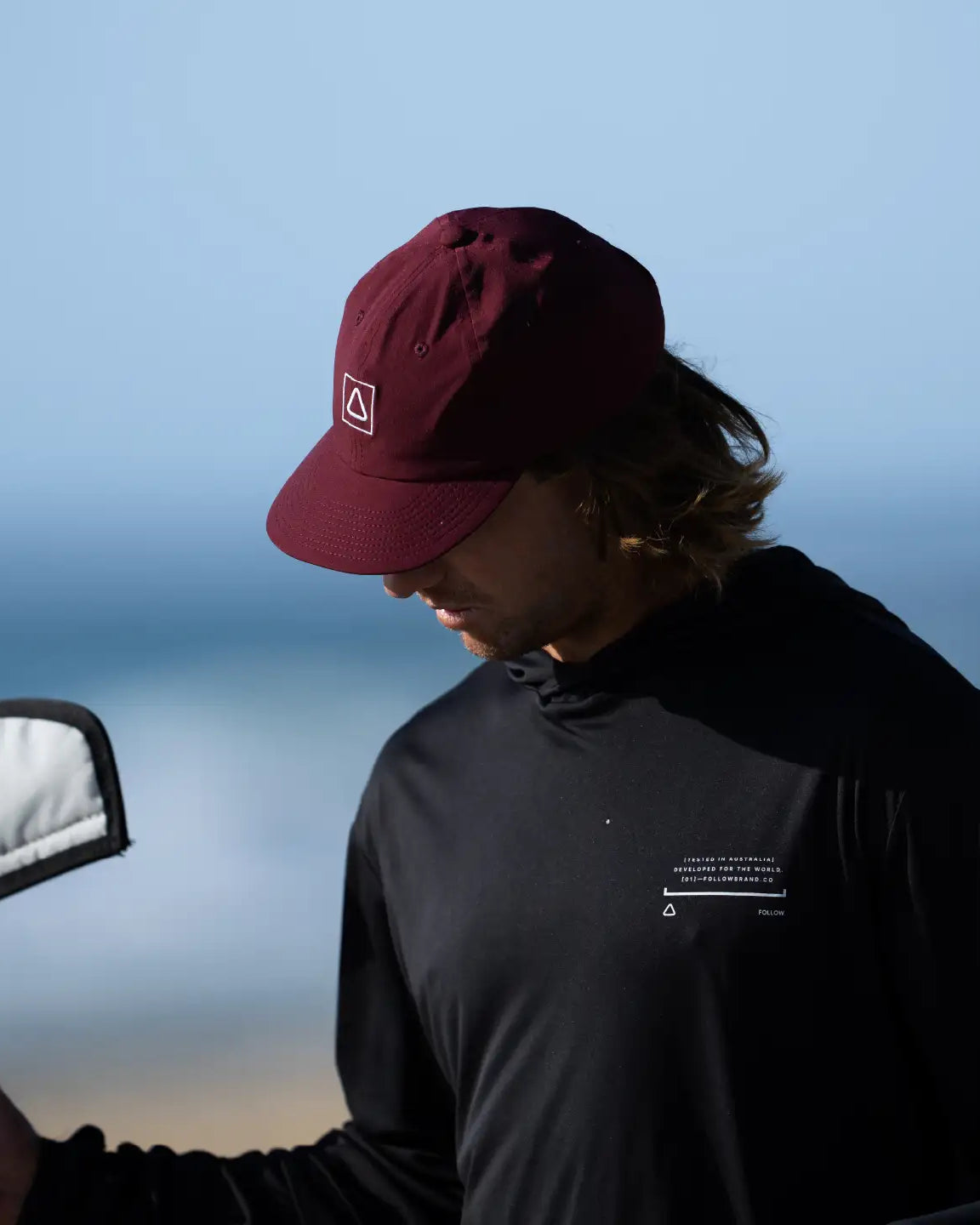A semi-curve brim, Regular Fit 6 panel hat with a rear Velcro Closure. Plastic fittings so no rust if used in the salt water. Our unique mid flex soft brim to stuff it in the backpack and embroidery logos. Snapback Shallow fit.